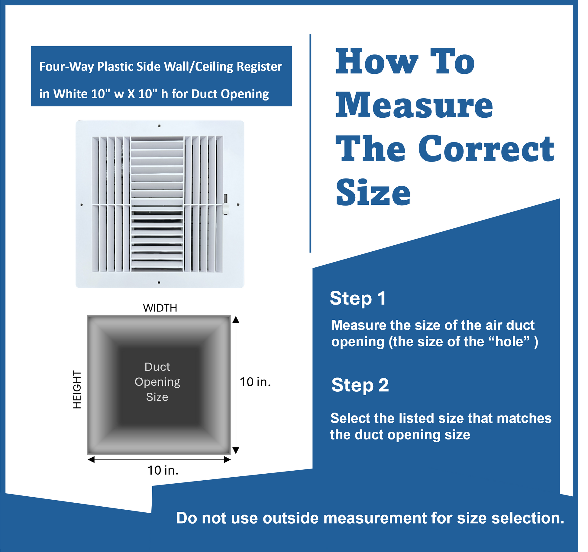 First thing to know about size selection: take the vent cover off the wall or ceiling. Measure the duct opening where the vent can fit in. Use the measurement to determine right size to buy. This product has listed size 10“w X 10”h is for duct opening measurement only, actual outsize overall dimensions is 11.75” wide by 11.75” high. If your duct opening size is 10” x 10”, this is the right size and will fit in well. If you measure outside or surface size, you will get a large one and it will not fit.