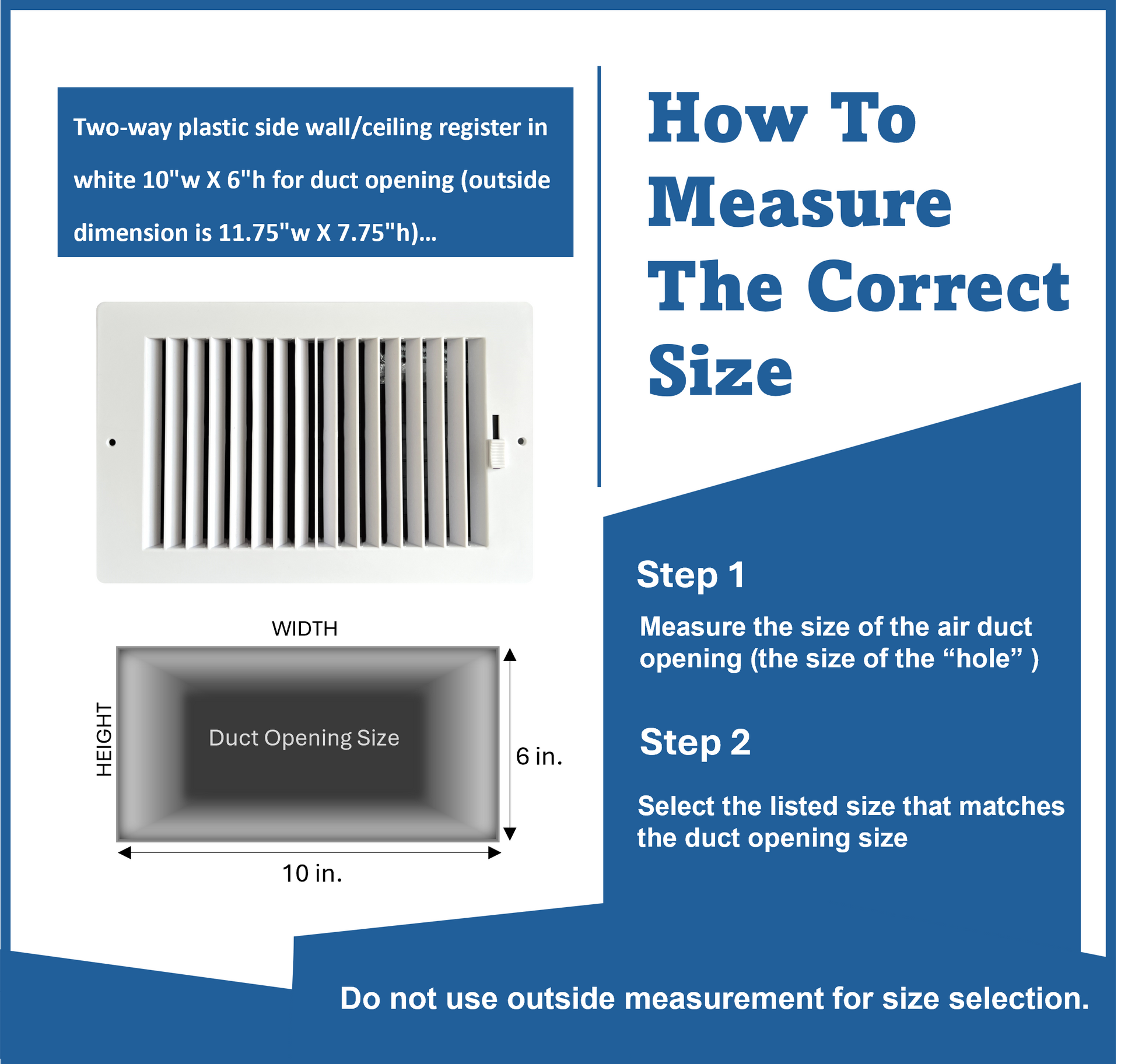 First thing to know about size selection: take the vent cover off the wall or ceiling. Measure the duct opening where the vent can fit in. Use the measurement to determine right size to buy. This product has listed size 10“w X 6”h is for duct opening measurement only, actual outsize overall dimensions is 11.75” wide by 7.75” high. If your duct opening size is 10” x 6”, this is the right size and will fit in well. If you measure outside or surface size, you will get a large one and it will not fit.